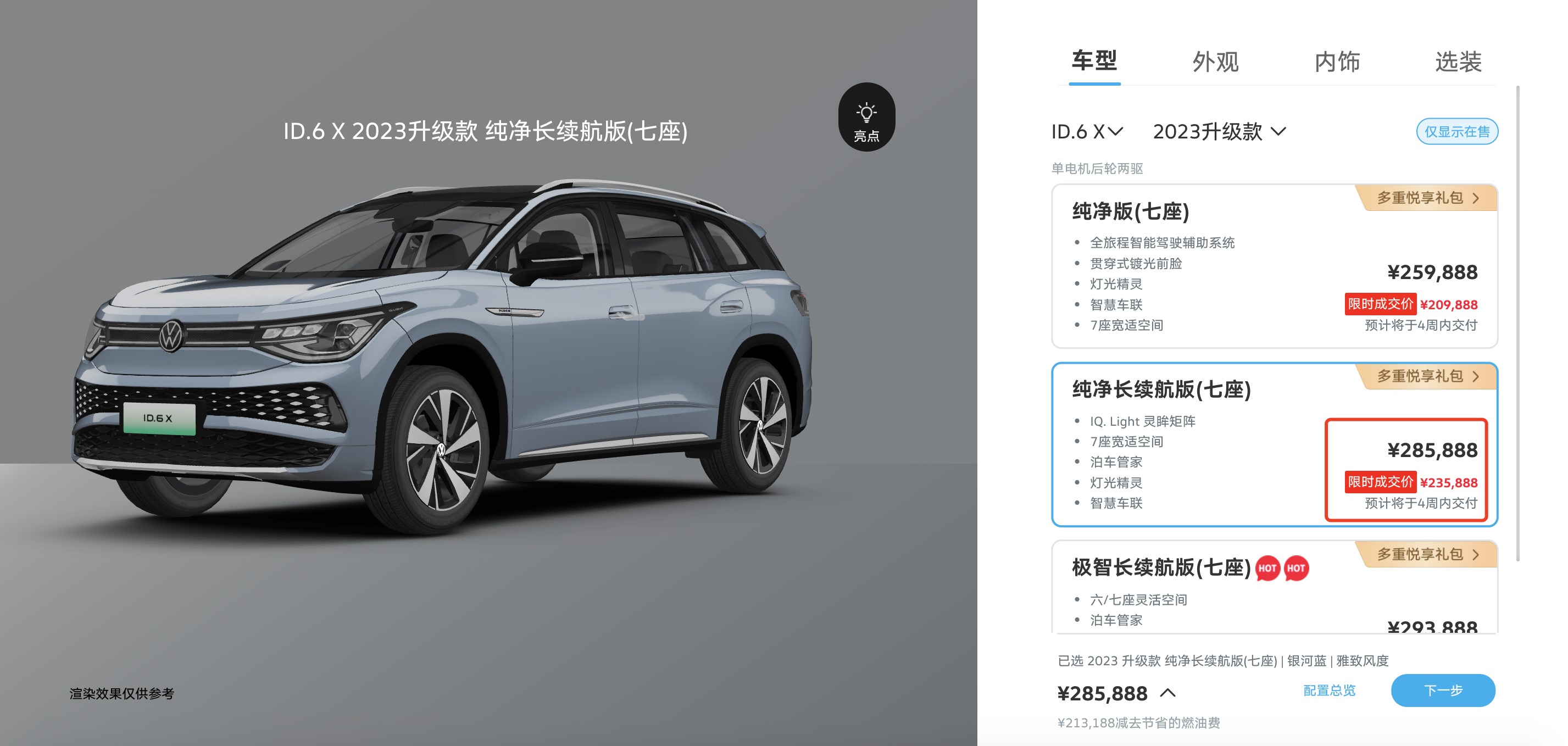 動(dòng)力續(xù)航上,ID.6 X提供多種性能、續(xù)航版本,主銷車型配備寧德時(shí)代三元鋰電池,容量為83.4千瓦時(shí),支持0.67小時(shí)快充,最高續(xù)航617公里。同樣,作為ID.家族旗艦級(jí)SUV,上汽大眾為ID.6 X推出限時(shí)優(yōu)惠,綜合優(yōu)惠至高5萬(wàn)元。從官網(wǎng)顯示,ID.6 X長(zhǎng)續(xù)航版指導(dǎo)價(jià)28.5888萬(wàn)元,限時(shí)優(yōu)惠價(jià)格23.5888萬(wàn)元,25萬(wàn)元落地一款6座純電中大型SUV,是不是很誘人?