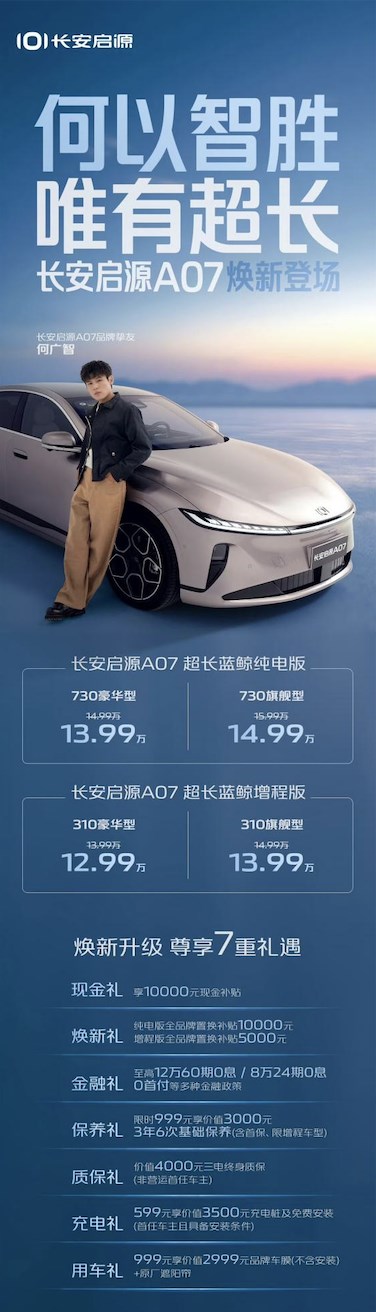 9月10日,長(zhǎng)安啟源A07超長(zhǎng)藍(lán)鯨純電版/增程版煥新登場(chǎng),共推出4款車(chē)型,長(zhǎng)安啟源A07超長(zhǎng)藍(lán)鯨純電版 730豪華型、730旗艦型售價(jià)為13.99萬(wàn)元、14.99萬(wàn)元;長(zhǎng)安啟源A07超長(zhǎng)藍(lán)鯨增程版310豪華型、310旗艦型售價(jià)為12.99萬(wàn)元、13.99萬(wàn)元,并提供七重誠(chéng)意大禮,全面滿足用戶對(duì)于越級(jí)價(jià)值的需求。