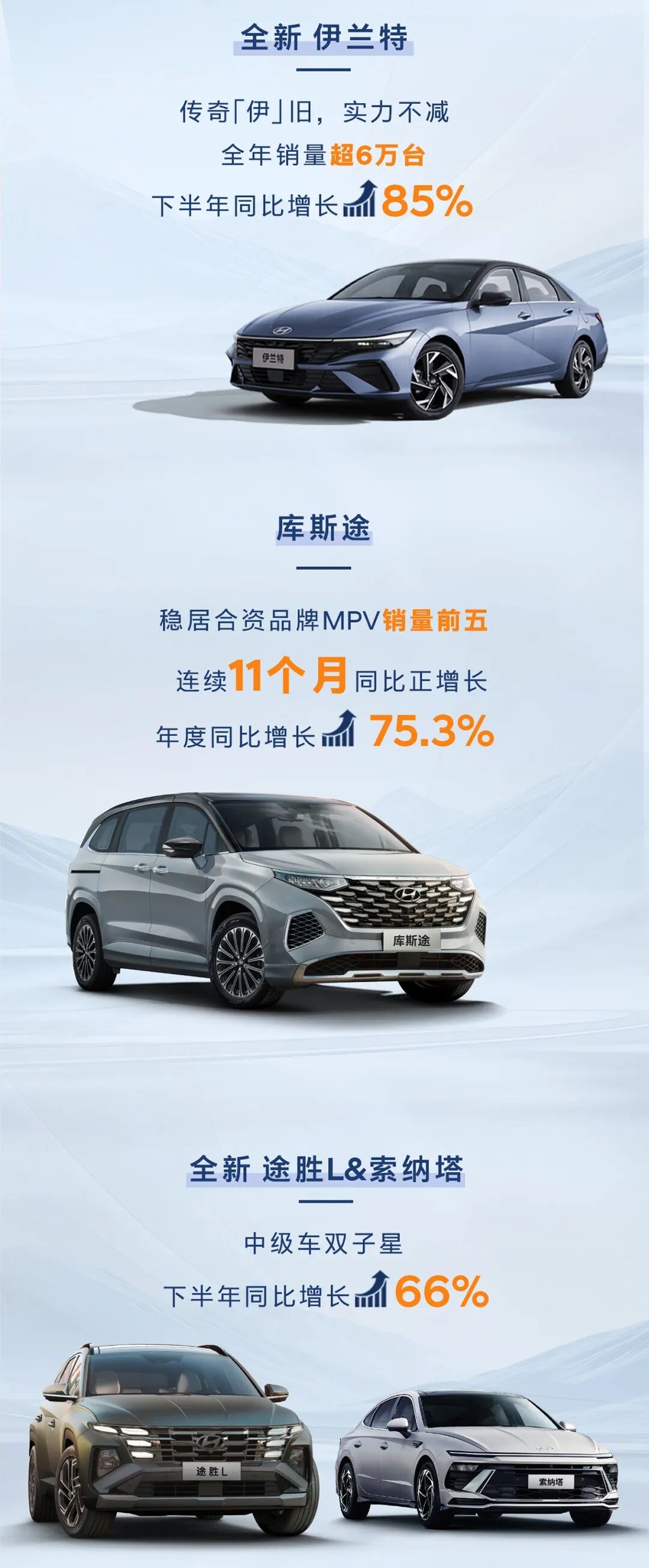 具體來看,燃油車基本盤持續(xù)夯實:家用MPV車型庫斯途憑借精準(zhǔn)的市場定位,穩(wěn)居合資品牌MPV銷量前五,連續(xù)11個月實現(xiàn)同比正增長,年度增幅達(dá)75.3%;索納塔與途勝組成的“中級車雙子星”下半年銷量同比增長66%,成為中級車市場的“中堅力量”;經(jīng)典家轎伊蘭特延續(xù)“家轎王”口碑,全年銷量超6萬輛,下半年同比增幅高達(dá)85%,以經(jīng)濟(jì)省油、皮實耐用的優(yōu)勢持續(xù)收獲家庭用戶青睞。